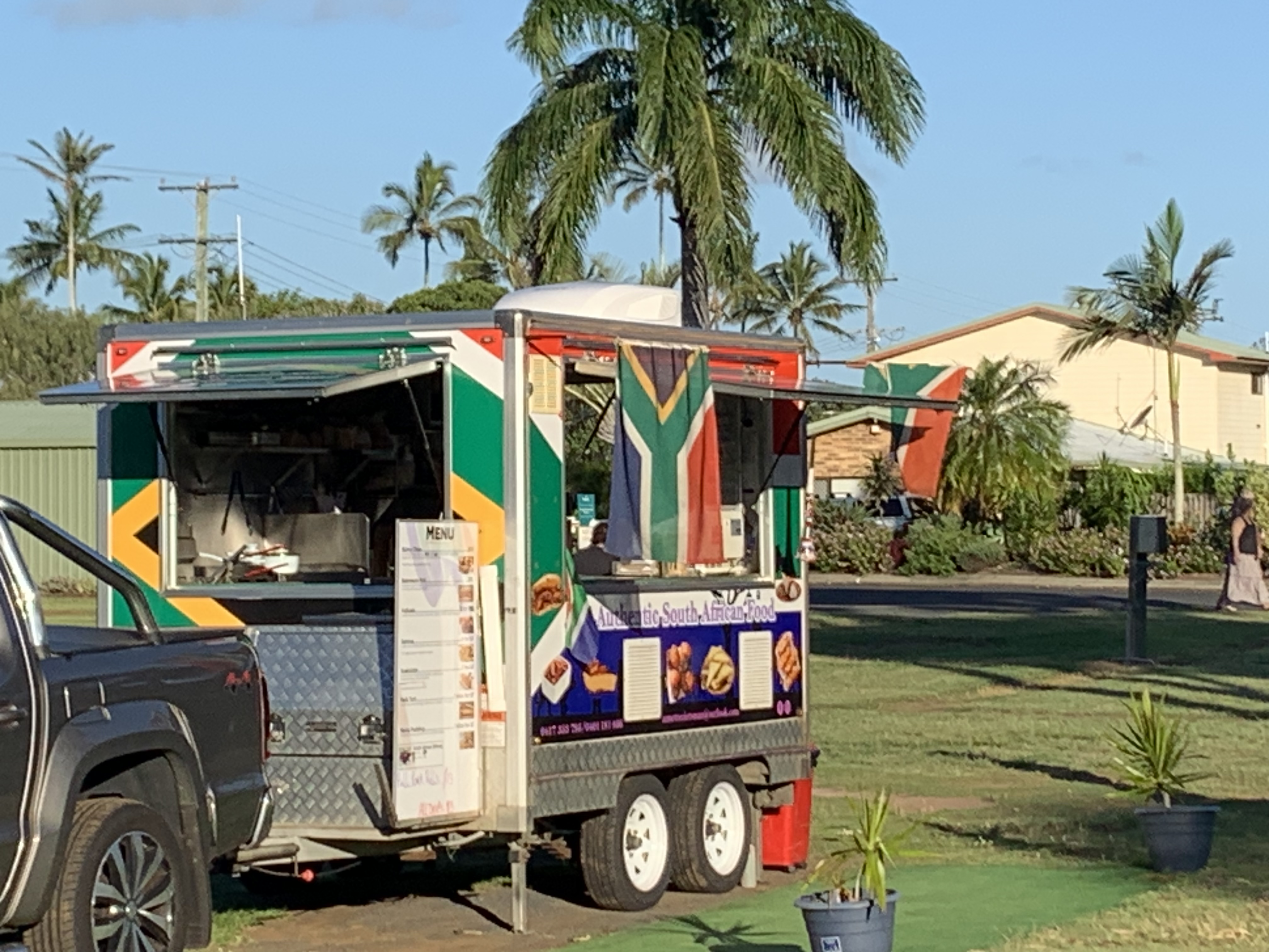 A developing trend for caravan parks is to get the local food trucks to set up shop in the grounds on selected evenings. Generally, the usual sort of fast food stuff. The park here though has tied up the local South African food truck, in national colours, with some quite tasty pre and post diner nibbles. Especially, the samosas.