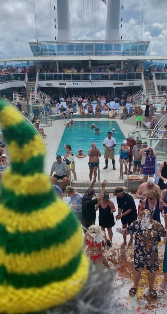 They then become Shellbacks, loyal servants of Neptune. In the old days it was fairly rugged stuff. Today, on the Coral Princess, it is mostly cream, spaghetti and other goey slippery stuff being thrown around. Some are asked to kiss dead fish. Lots of music and cheering.