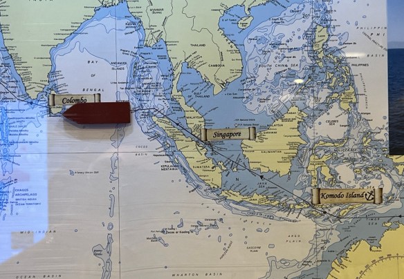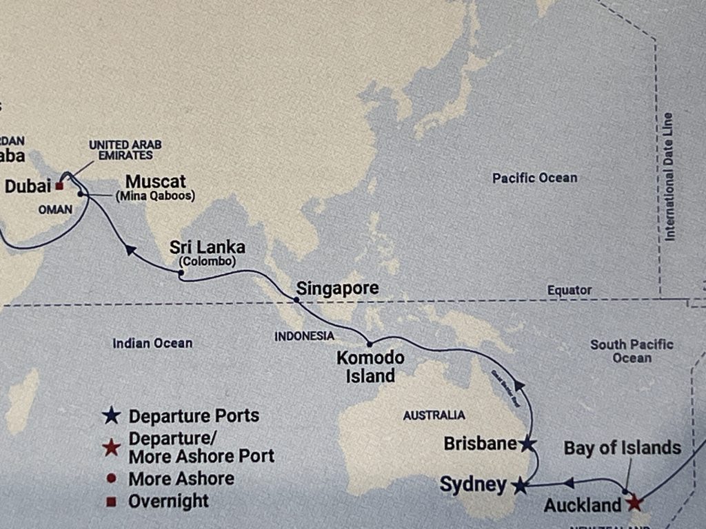 The Coral Princess is leaving Brisbane and will be taking us up the Queensland coast, through the Torres Strait to Komodo Island, where those big lizzards live, in that string of islands running down from Bali towards PNG. Then, Singapore and across the Indian Ocean to Dubai via Colombo in Sri Lanka.