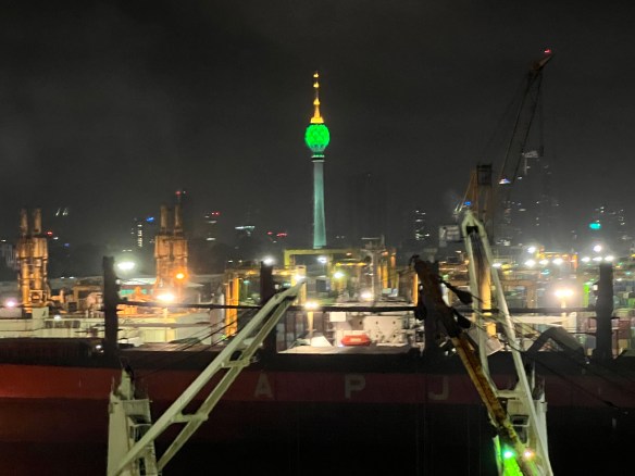 The ship though seemed delayed and we didn’t leave port until nearly 11pm. The Colombo tulip flashing from red to green and blue in the night sky as we sailed away.