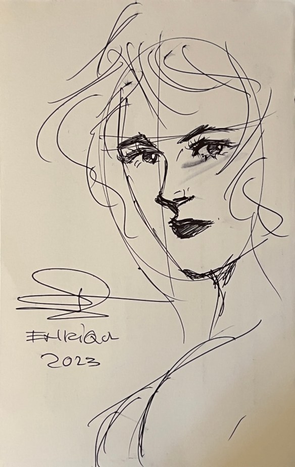 Food and entertainment continue to be mostly excellent. One of our waiters put together a quick sketch of Homealone looking inquisitively at her plate. Certainly got the eyes!