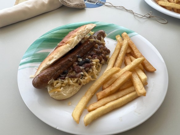 Had an excellent hot dog today, 3 bean nacho sauce and cheddar cheese atop. Thought I was in Houston!