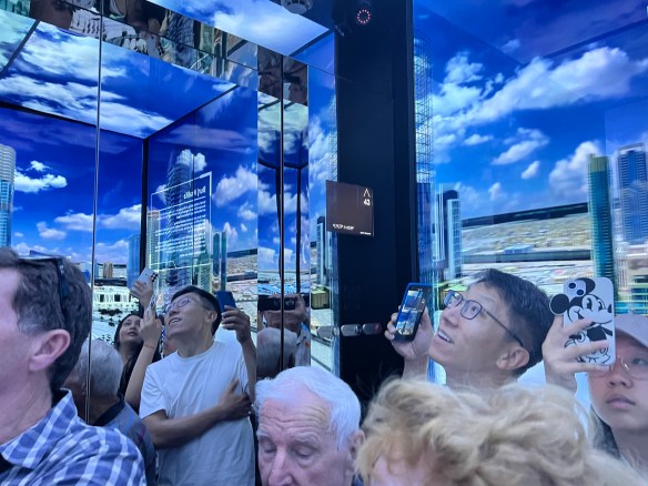 The lift to the deck is silent and takes about 40 seconds, as you rise the lift interior lights up with views of the urban landscape and skies. Quite spectacular, as are the views. At this time of the year the skies are quite heavy with dust and haze. Our guide tells us it’s not smog. Long distance views are compromised but the views down and over the city show the enormous amount of property development taking place.