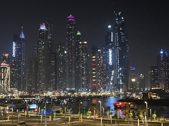 Jumped on the Red Bus and headed back to the ship for dinner! Dubai is an interesting place, a cultural melting pot in a traditional society. All the ‘bigness’ and razzmatazz makes it all seem a very plastic and artificial place. Nice to visit but wouldn’t want to live here. The ship sailed away later that night at around 10 pm. City all lit up against a dark sky.
