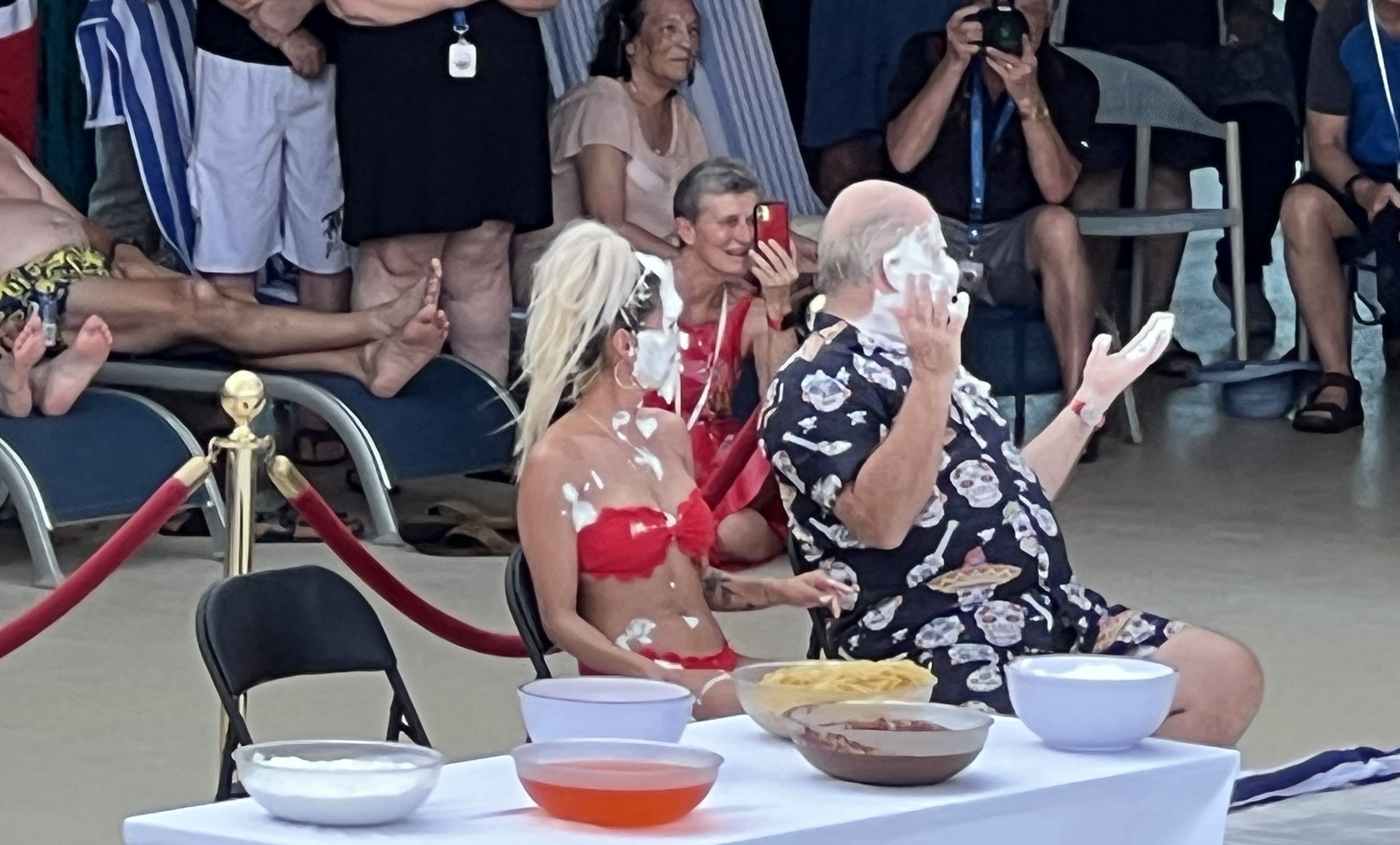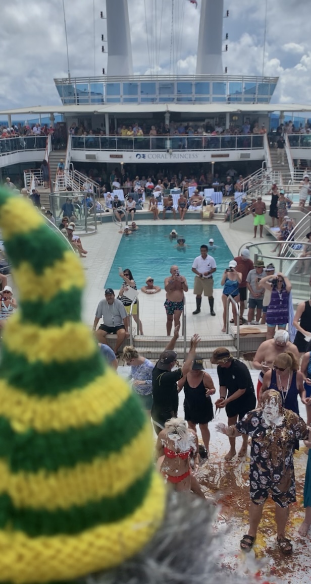 They then become Shellbacks, loyal servants of Neptune. In the old days it was fairly rugged stuff. Today, on the Coral Princess, it is mostly cream, spaghetti and other goey slippery stuff being thrown around. Some are asked to kiss dead fish. Lots of music and cheering.