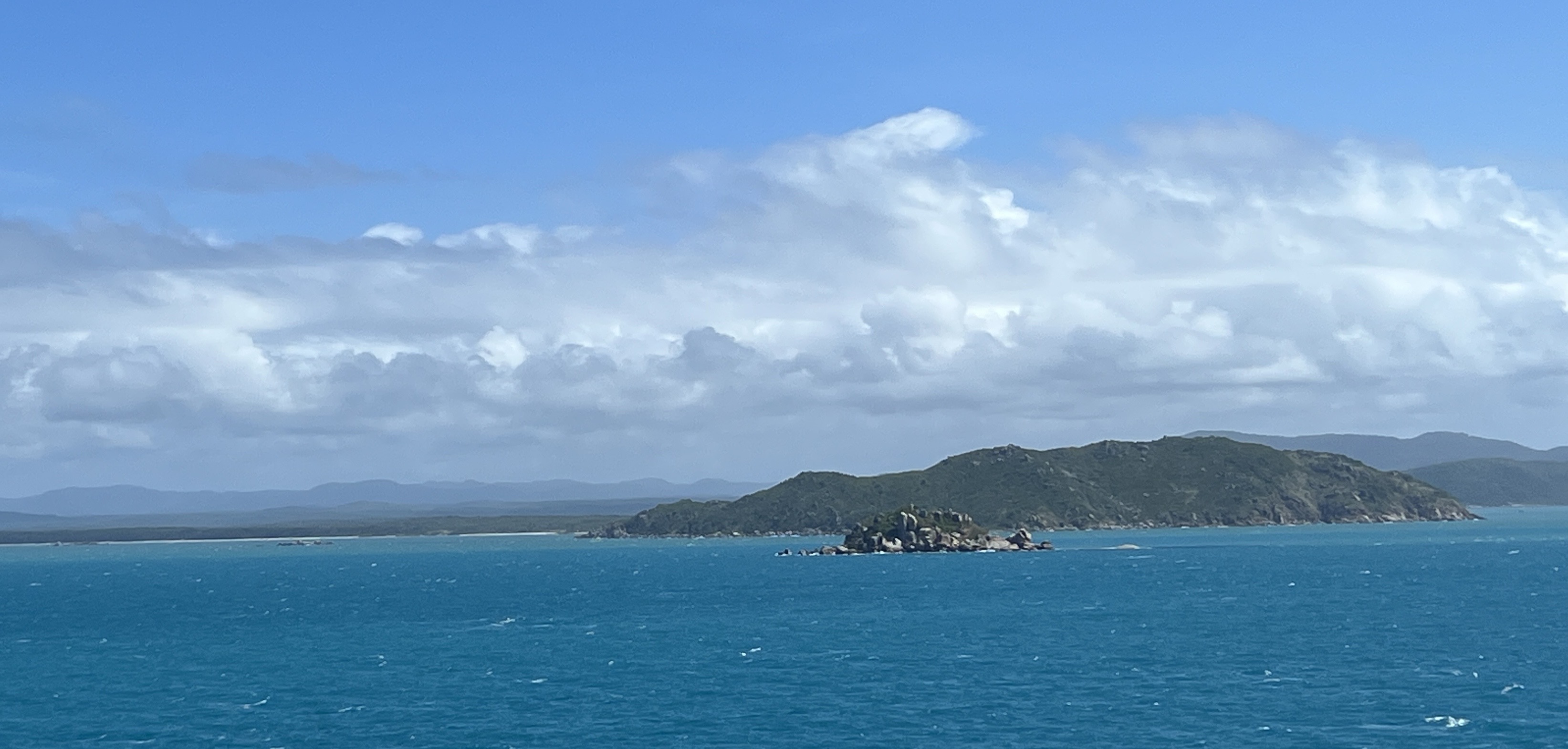 It is a pleasant afternoon, sunny with some cloud. Low cloud out to the west on the horizon, so we may get a good sunset going past the Glasshouse Mountains. All good for the sail away at 5pm.