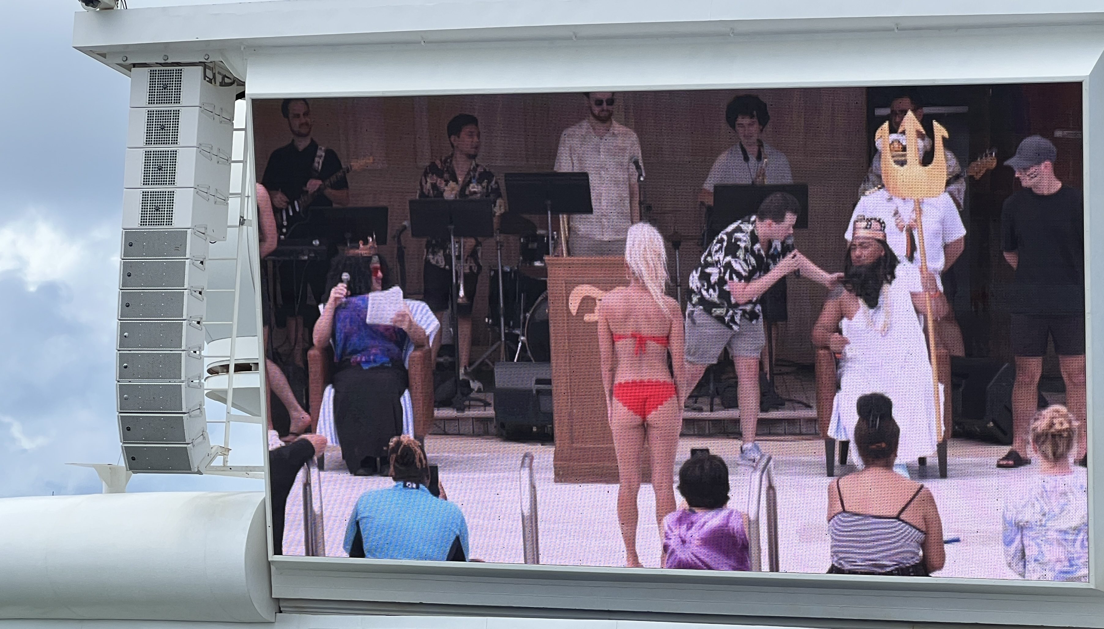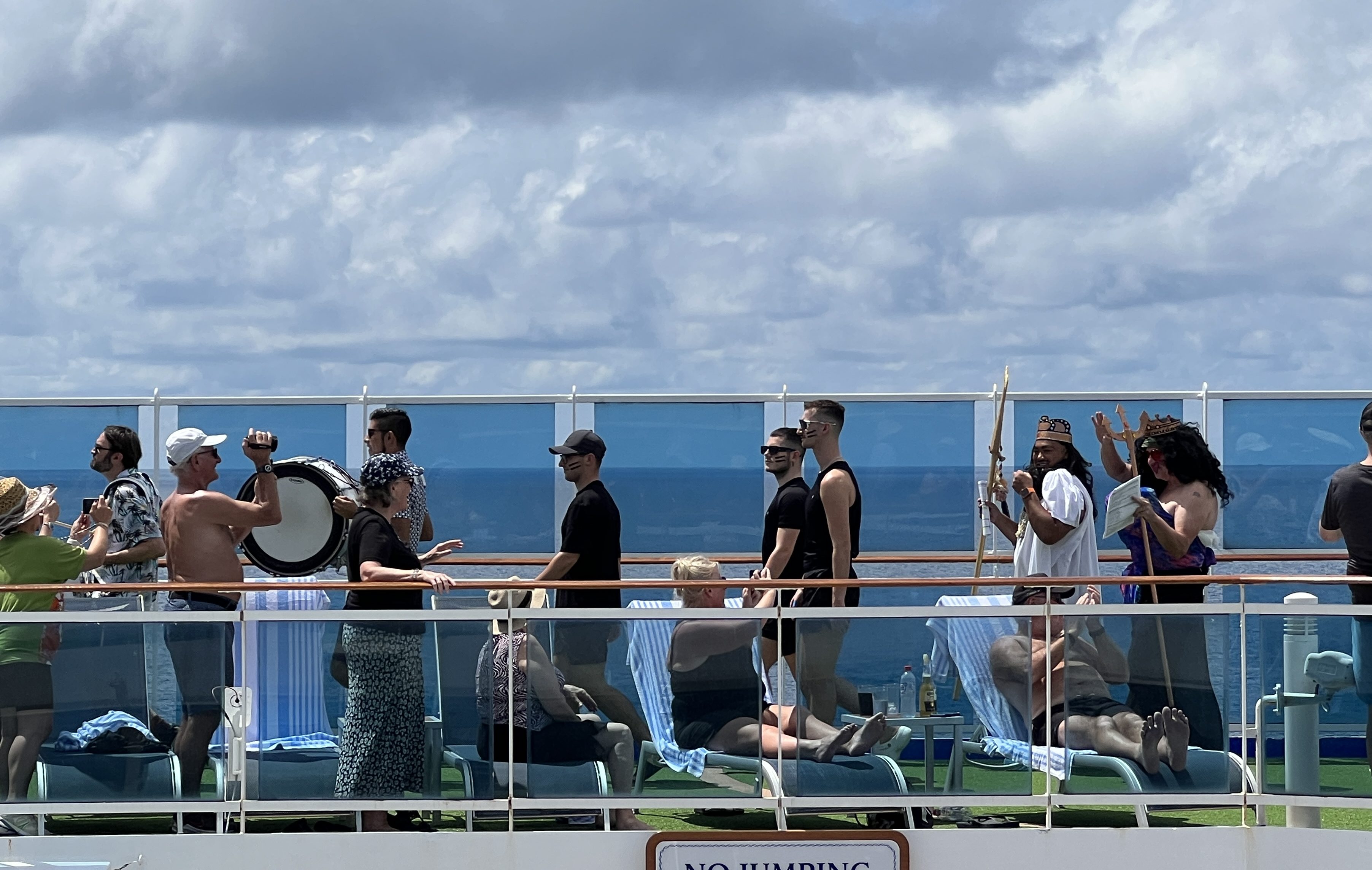 The old naval tradition is to initiate those on board who have not crossed the equator, the Pollywogs. King Neptune, Roman god of the water, and his Queen lead a procession along the decks to their thrones.