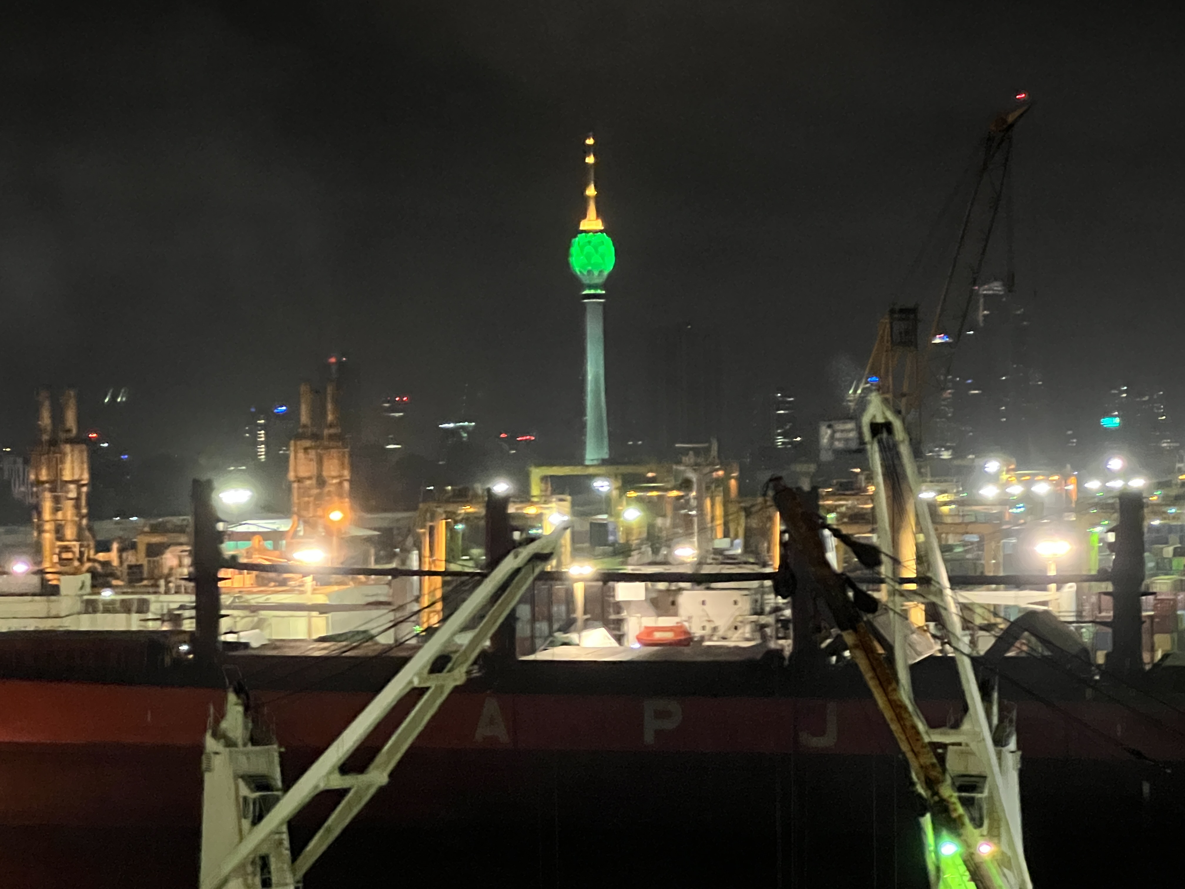 The ship though seemed delayed and we didn’t leave port until nearly 11pm. The Colombo tulip flashing from red to green and blue in the night sky as we sailed away.