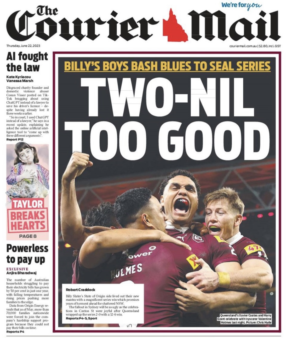 One of the highlights of this leg was the win by Queensland in the second State of Origin fixture. All aboard look forward to a clean sweep at he next outing, at least the Queenslanders! The outstanding Courier Mail newspaper sums it up well.