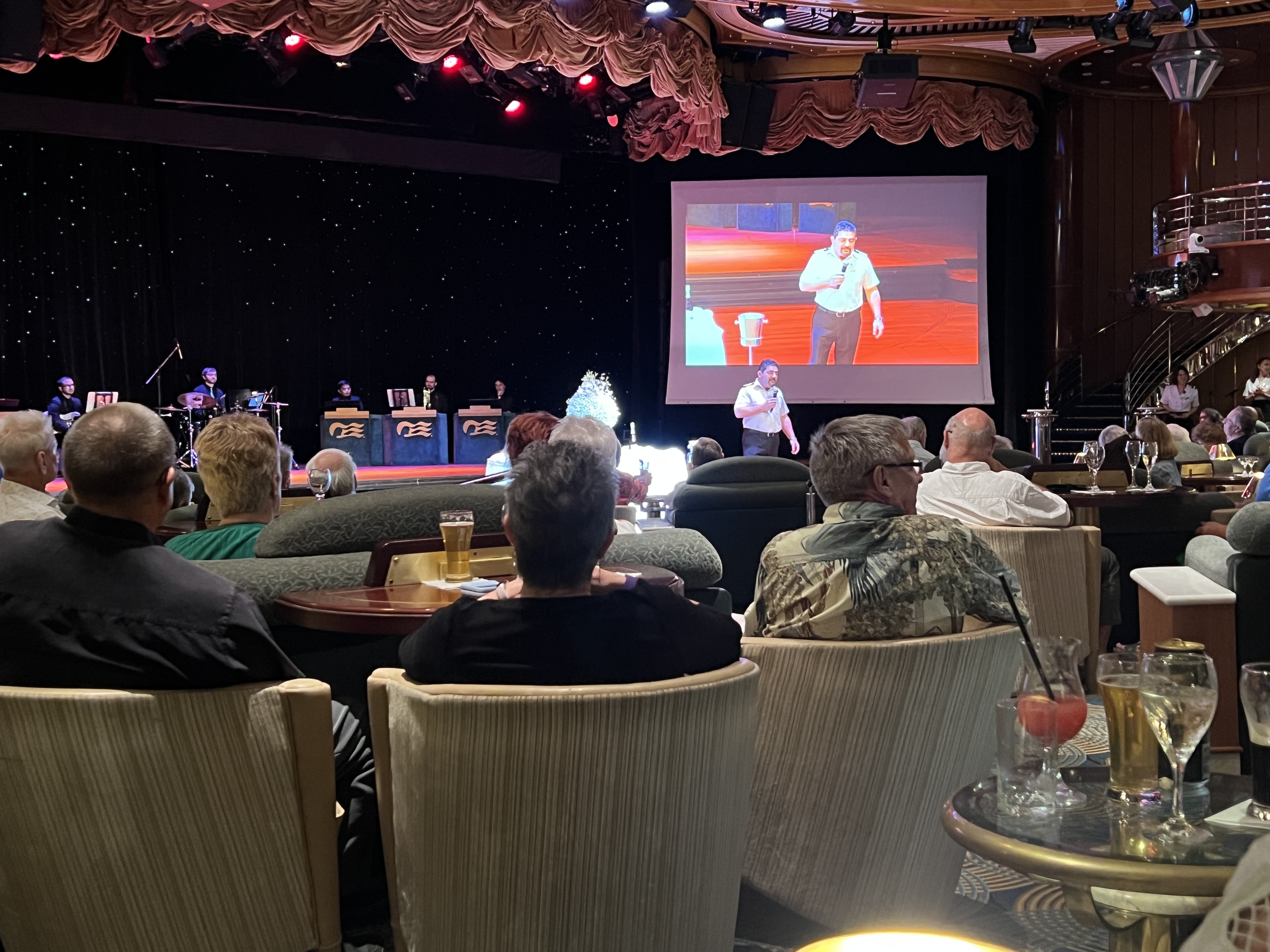 There is also a Captains Circle Party to hear a chat from the Captain. It was at this party that we were told who is on board with the most cruise days all up. The top three. Slobro can’t recall the numbers exactly but here they are in round numbers. First, 1800 sea days and 174 cruises all up. Second, 1700 sea days and 142 cruises all up. Third, 1400 sea days and 121 cruises. Something like 5-6 years cruising, apparently more or less constantly! Slobro, 17 days and counting!