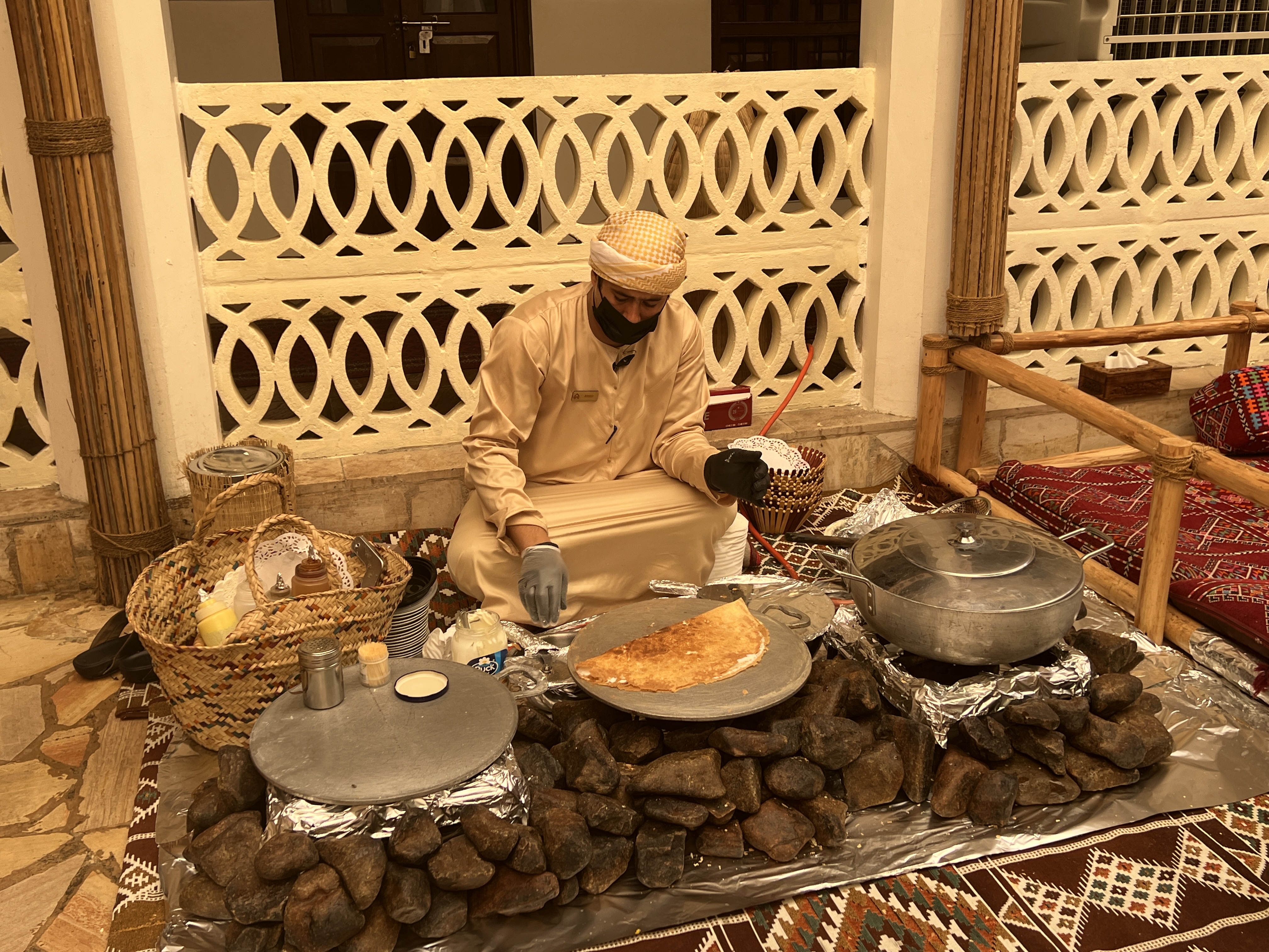 Back in 2007 we had spent a few days here in Dubai and the old historical district and sites were somewhat familiar to us. We had stayed in a nearby hotel. Allthego had done some research on eating establishments, looking for a place offering a traditional menu and ambience. The Al Khayma Heritage Restaurant came up with good reviews. The trick was to find it, we had the address and lo and behold the Red Bus went right past it. But we had missed the stop and had to walk back from the next stop. Again luck was on our side as we walked right past a post office and Allthego was able to get his post cards away, including one from Colombo!