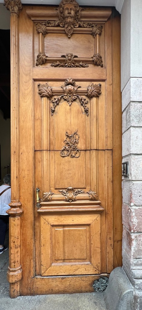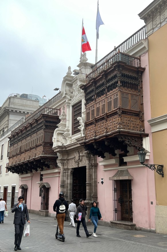 These are a couple of photos of mid 1700s Spanish style houses, well preserved. Brightly coloured houses are a long historical response to Lima’s climate. For about eight months of the year, April to November, the sky is very grey. It looks like it is going to rain but it stays dry. The guide referred to it as ‘Donkey belly sky’. Caused by the Andes rain shadow over the coastal strip and currents running up the coastal waters. We were fortunate in the sun coming out around midday for awhile and some pale blue sky. Otherwise things look a bit drab!