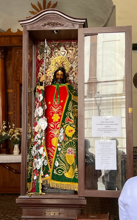 By chance we are in Lima on the 28th of the month and witness a long tradition. St Jude’s day, every month on the 28th people line up for blocks to get into the big Franciscan church to pay their respects, bring flowers and make pledges to St Jude. Flower sellers do a great trade it seems.