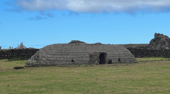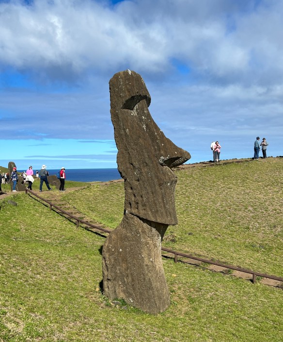 We have stopped here to have a look at the famous massive stone carvings known as Moai (statues). They are quite fascinating and one wonders why and how they were made in the first place. Let alone how they were transported from the quarry where they were carved to where they were erected. Up to 18 kilometres by a society that had no mechanical aids. Then why were they all knocked over, in the main ‘face first’?
