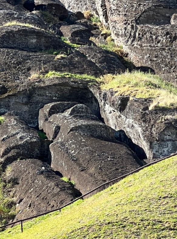 On our walk around the ‘quarry’ area we saw numerous partly finished Moai, including one where the statue was partly carved and still in place in the rock bed. It is all a bit complicated to explain, but once the carving was partially complete and the statue ‘released’ from the bed rock it was slid somehow down the hill into a hole so that it could be stood up.