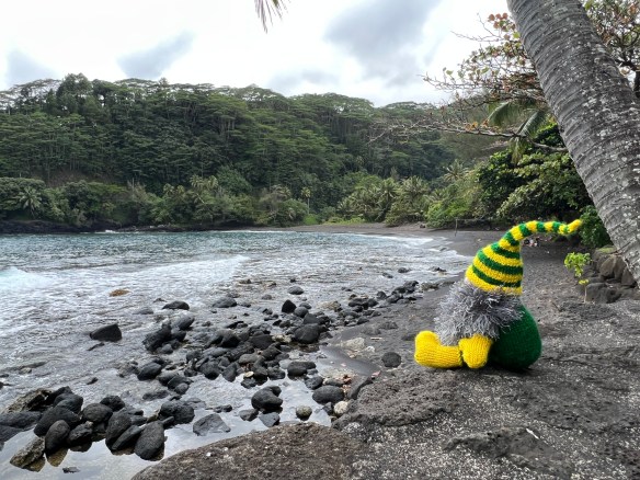 Today the location is a popular spot for the locals to enjoy the parkland and black sand beach. The Mutiny on the Bounty is also remembered here with an obelisk. As we continue around the Island the rain starts in earnest and the spectacular view from One Tree Hill over Matavai Bay is shrouded in cloud. Cook used a red flowered tree on the top of the hill as a navigation aide.