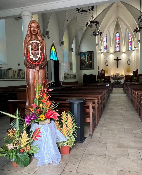 We had a quick look inside the Papeete Cathedral, very different to the European ones we have seen. Back on the waterfront there was the big replica sea going canoe pointing out to sea.