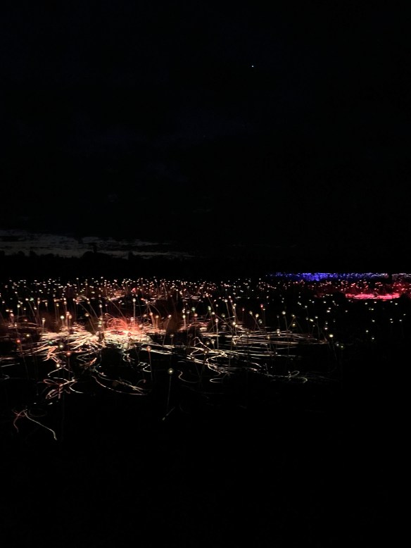 The next morning we faced an early 5 am start to do the Field of Light and Rock sunrise experience. In the early morning it is quite chilly, not far off zero. The sun rises circa 7.30am and we have 45 minutes or so wandering through the lights before heading back to the top of the sand dune to watch the sun rise and light up Uluru.