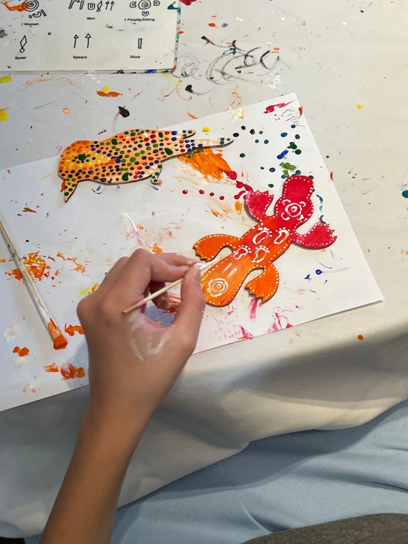The morning had been set aside for some cultural involvement. First up was animal painting for kids. Not real animals but small wooden cut outs. Although, I suspect Nomads could participate if there was room. But they were set up for 60 and had to turn away some kids. So oldies didn’t get a look in. Alyssa and Piper joined in enthusiastically and managed to each complete two animals/birds. Dot paintings. They are both quite good art wise and seem to know what they are doing painting wise.
