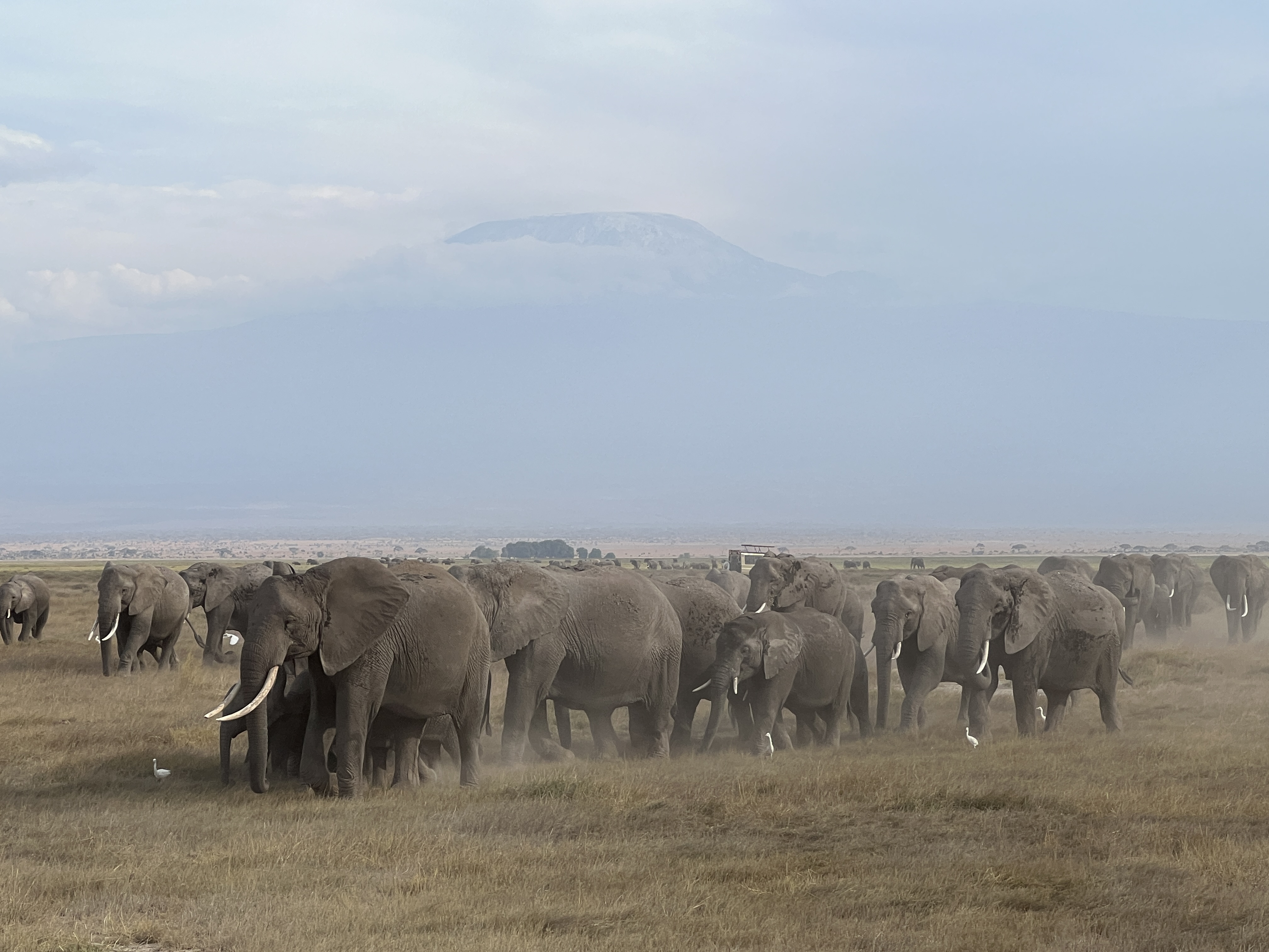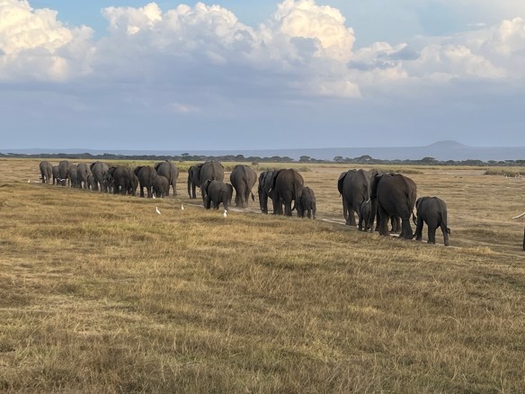 Next morning we were off on a 6am game drive through the Park, famous for its elephant population and Mt Kilimanjaro that looms large over the landscape. Unfortunately, it is shrouded in mist and cloud while we were there. So, couldn’t get that classic photo of the elephant in front of the mountain in clear blue skies. Had to settle for a herd of elephant massing beneath the shrouded table top of Kilimanjaro. Not bad!