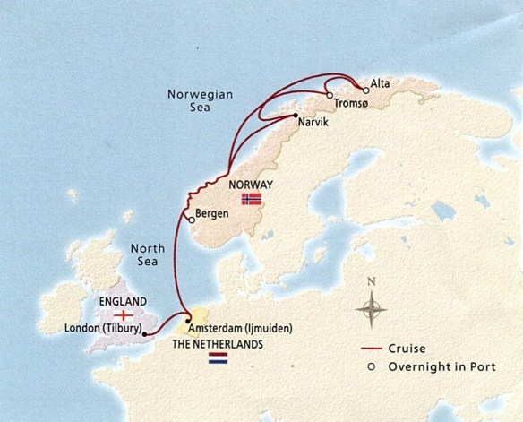 We have had an afternoon stopover at Ijmuiden, the port for Amsterdam. I think the stop here has something to do with getting the arrival time into London right after the three sea days coming down the Norwegian coast from Tromso, well over 1200 km. We are due at Tilbury Docks about 6 am to disembark.