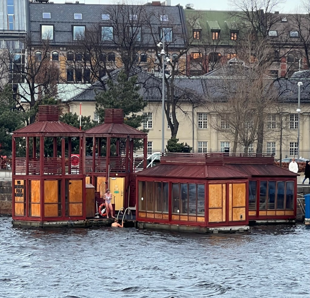 Across the bay there are a few saunas floating on the harbour. The idea is that after the sauna you go for a dunk in the harbour! Quite invigorating, some ladies of various shapes and sizes were having a go. Homealone, managed to get a close up of a couple of gals going in. The sauna would be ok, not sure about the cold plunge!