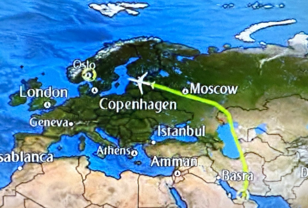 We had an interesting flight path though, avoiding Ukraine but in so doing we went further north, crossing the Caspian Sea and flying just south of Moscow. Then across the Baltic Sea and over Stockholm to Oslo.