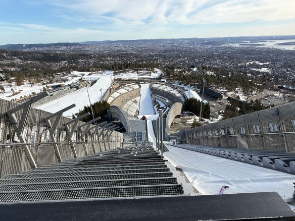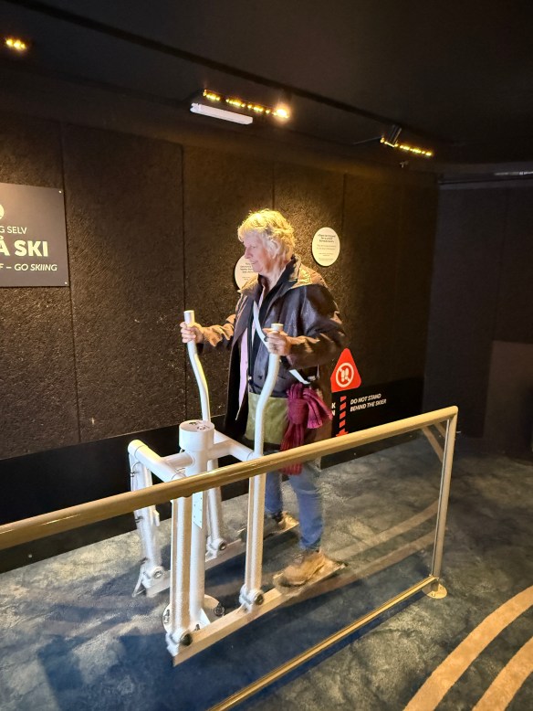 The main objective here was to look at the Ski Museum. Holmenkollen was the location of the 1952 Olympics and also held a number of World Championships. An interesting centre with plenty of old gear. Also some historical bits from the Norwegian polar explorers Nantzen and Amundson. Allthego, thought he saw an old pair of his 1970s Blizzard brand skis on display. Blizzards are not hard to forget, but maybe they weren’t! We both had a go on a cross country race simulator, the two other AI contestants beat us easily.