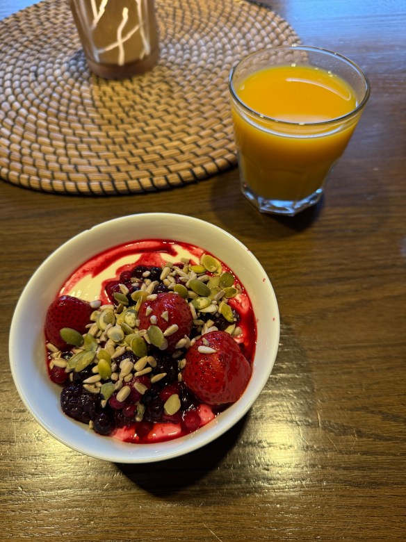 Our room in the hotel was quite small, but comfortable. Not much space for luggage! Breakfast was included so we started the day with a healthy alternative. Allthego occasionally lapsed and finished off with bacon and eggs.