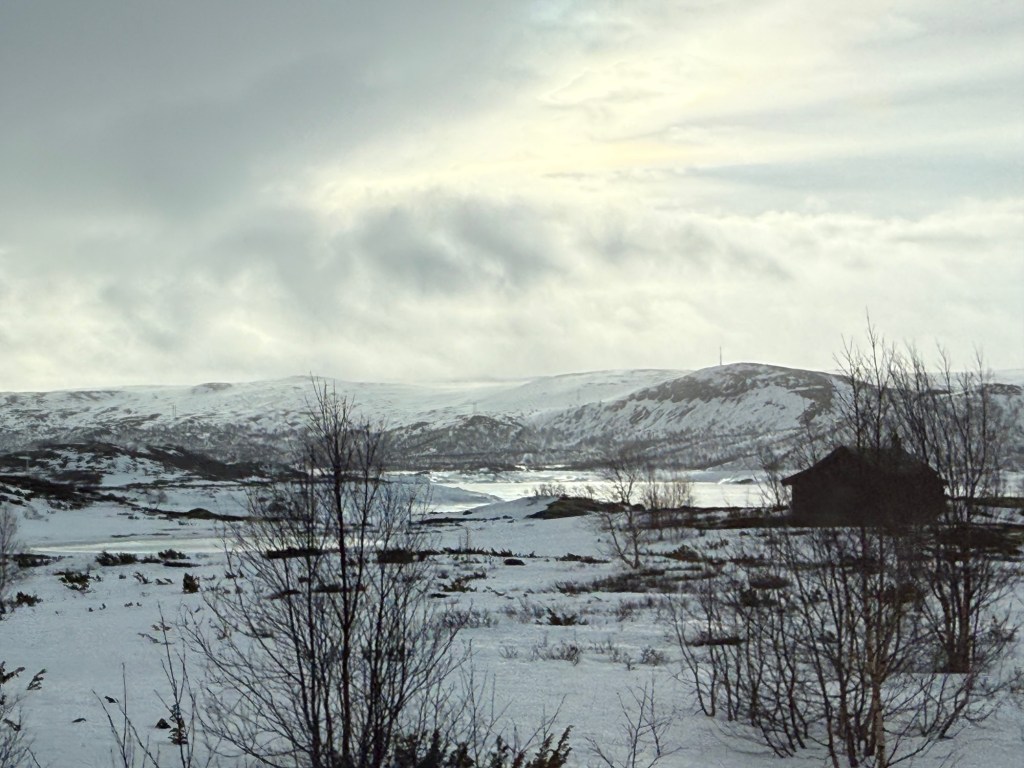 At the appointed hour of 6.25am our train from Oslo departed the station. As planned we were aboard!Fortunately, it was only a 10 min stroll from the hotel to the platform with our overnight bags. The main bags had been taken direct to Bergen by a porter service. Saved a lot of bag hassles. A bit of sun and blue sky to start but it all clouded up as we headed higher into the mountains.