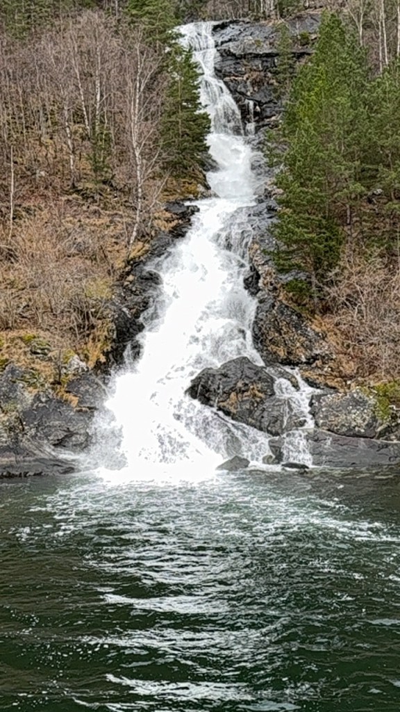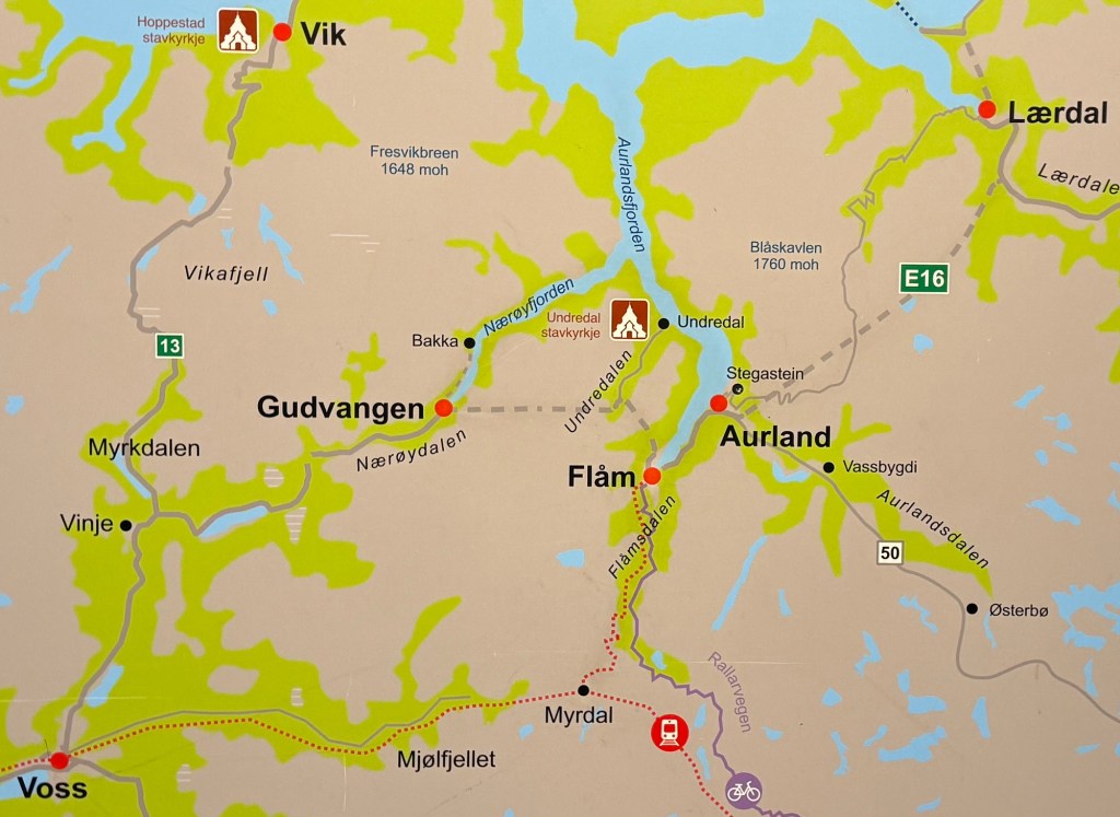 This was a wonderful two hour trip on an electric ferry (‘Future of the Fjords’) that holds 400 people, we probably had only 150 for this trip. Plenty of room and silent, except when side thrusters went on. Big racket! The map below shows the trip from Flam.