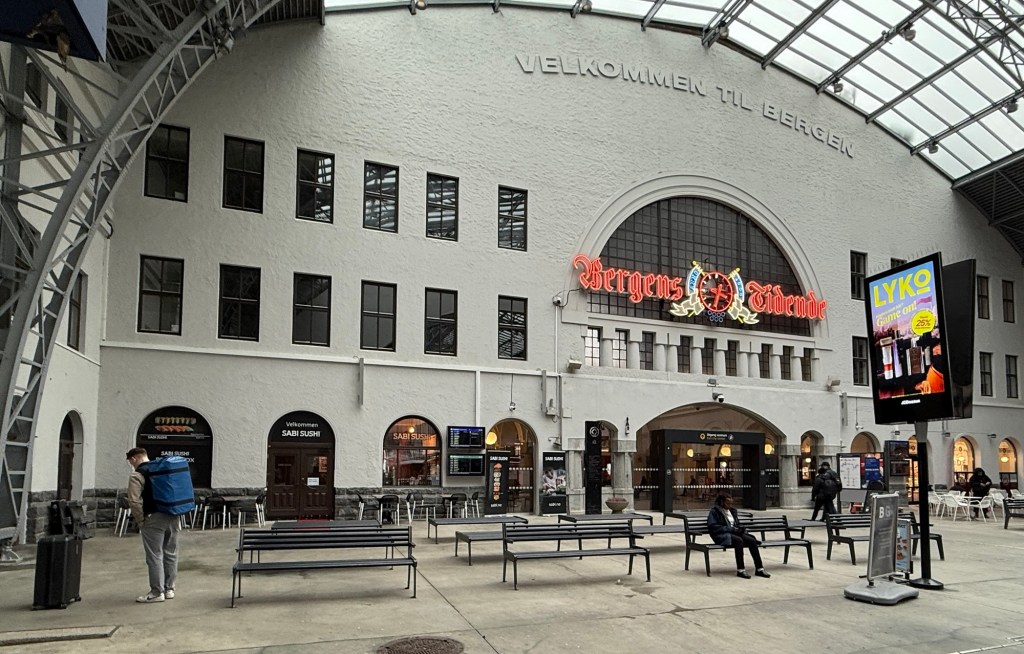 At Voss we have an hour to fill in before the train to Bergen arrives. The Voss gondola leaves from the station and it was tempting to take a ride up….. Homealone reluctant (probably a good idea) so we sat and waited for the train. Along it came, no booked seats this time. We did get a good window seat though, the river continued to be the main attraction. The train got along at a fast pace, so photos didn’t work. Eventually, we pulled into Bergen Railway Station.