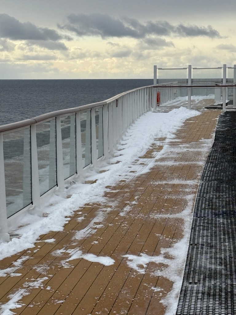 So we have snow and ice on the sun deck and across our balcony, temperatures are sub zero and barely getting to 5 or 6 during the day. Still it is ‘nice’ and a bit sunny from time to time, no need for sunblock.