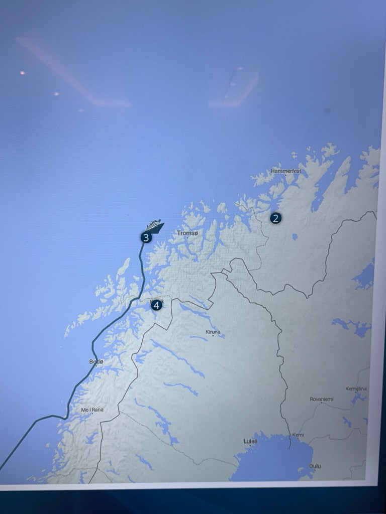 We left Bergen around 4.30pm and were due to arrive in Alta sometime before noon in three days. It’s more like three nights and two days cruising time. Depending upon the exact route it is 900-1000 km. The Captain has chosen to seek the open sea earlier than first planned. The seas are calm and we can make good time, we will join the Inside Passage further north.