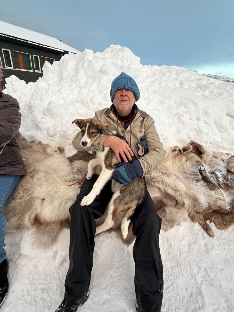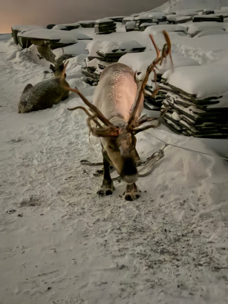It’s cold up on the mountain, sleet is interrupted by snow and the skies remain clouded. Little chance of seeing any lights. Instead we huddle in some huts and hear tales from the past about slate and the lights. Have a couple of hotdogs and coffee while we wait. A local Sami chap visits for a look and brings a reindeer, poor animal seems to have no interest in amusing the onlookers!