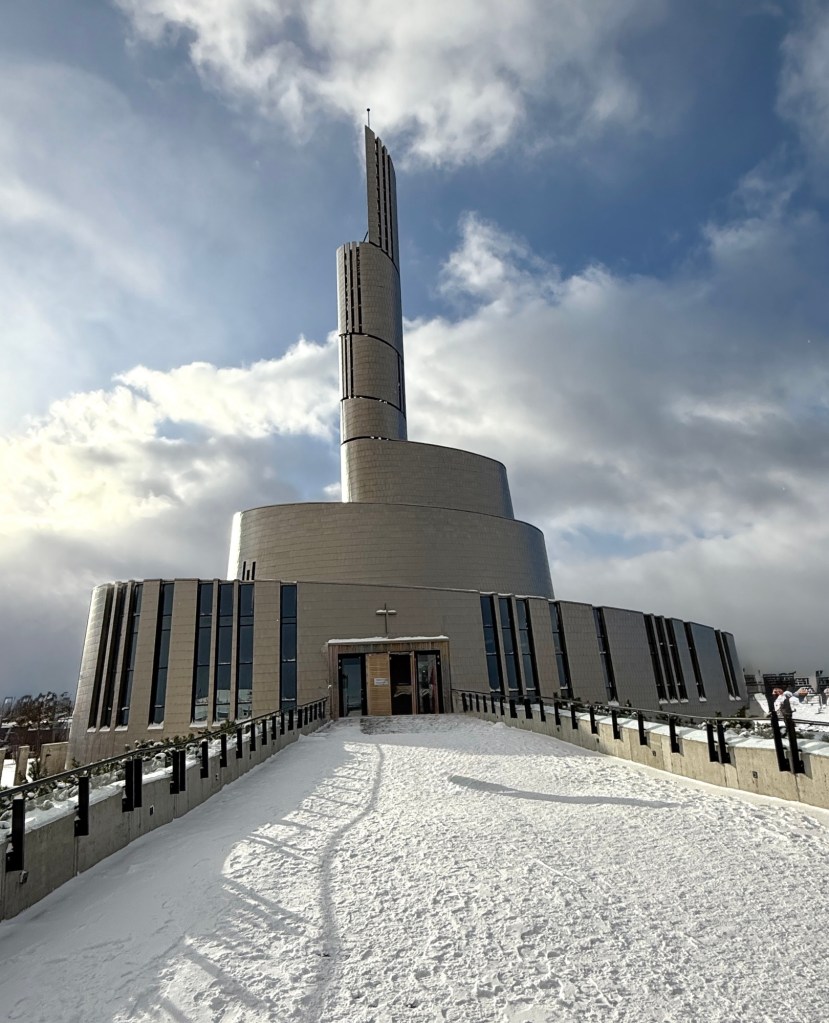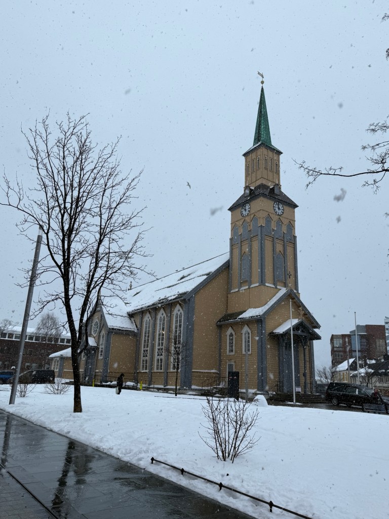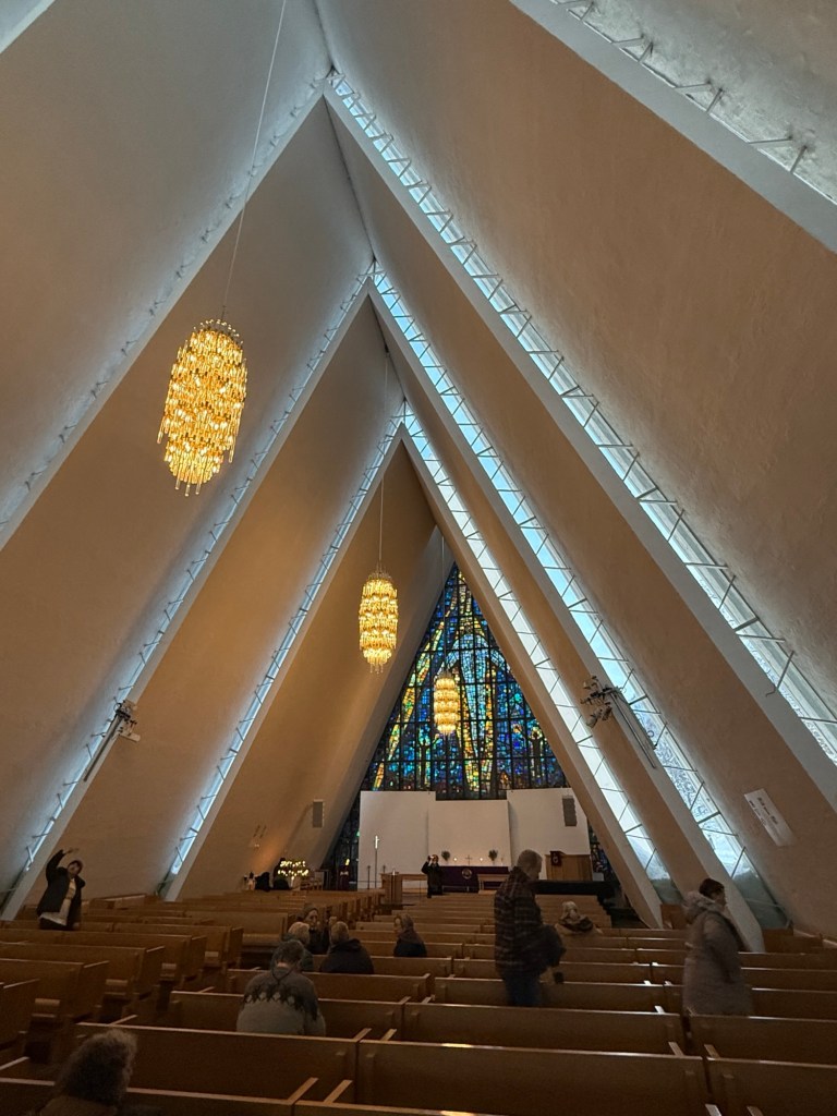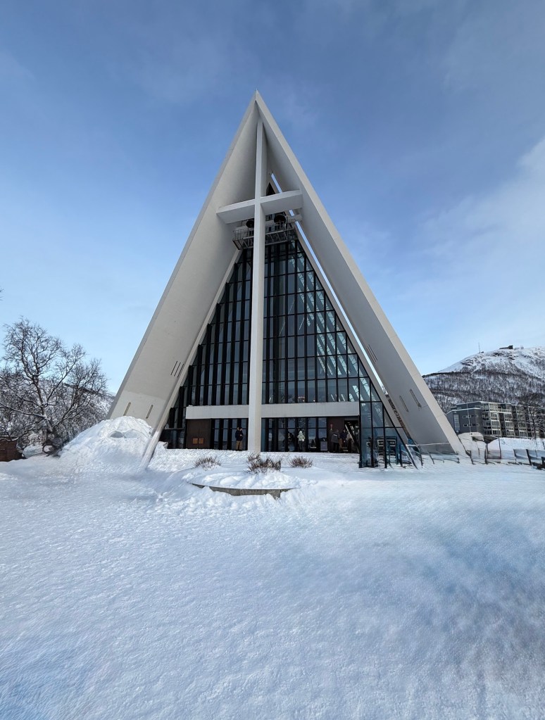 Moving on from here the bus entered a tunnel under the fjord and popped up on the mainland. Tromso is spreading out! On this side is the Arctic Cathedral, a modern triangular construction that overlooks the fjord. A bit of blue sky!