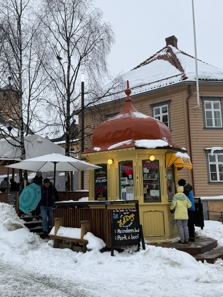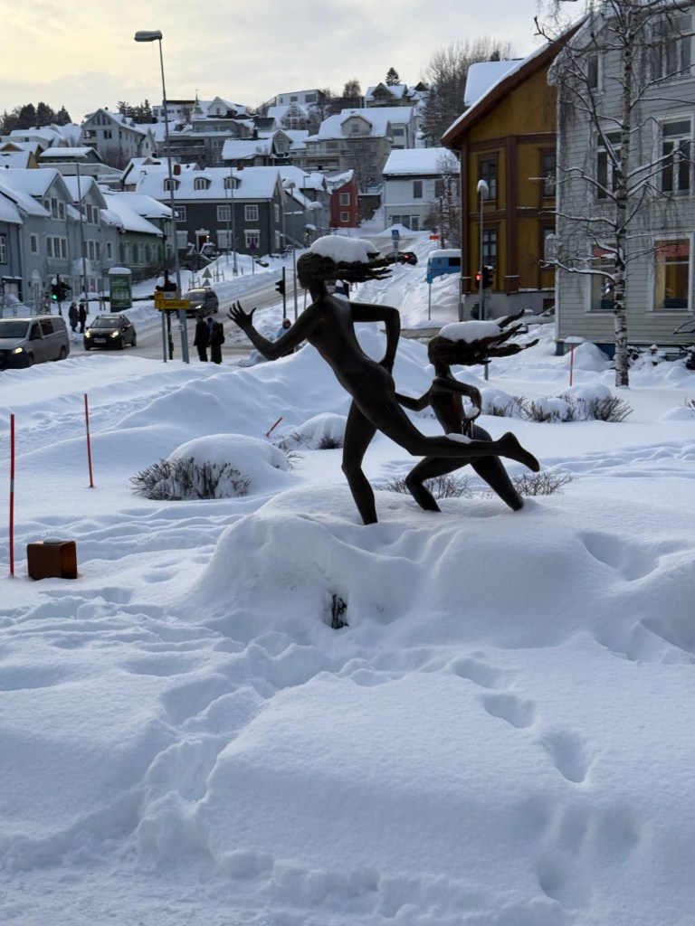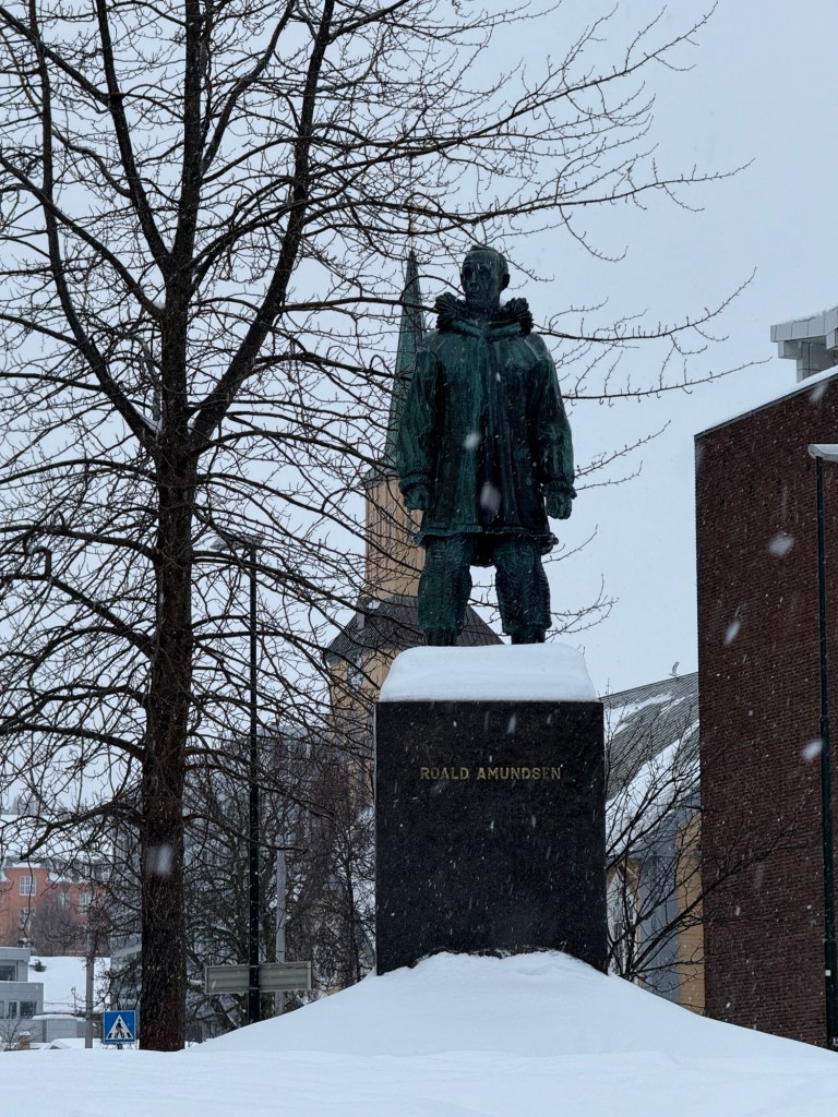 Tromso is on an island and the bus took us around the town and some of the highlights buildings wise. A statue of Amundsen, a favourite of the people here, looks over a snow covered park.