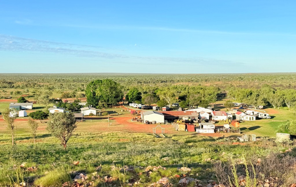 BB is an indigenous cattle station that also provides camping facilities for about 40 vans. Very comfortable spot. We settled in for the afternoon. Late in the day Allthego climbed the nearby hill for a look over the landscape. Great view of the campground and surrounding countryside.