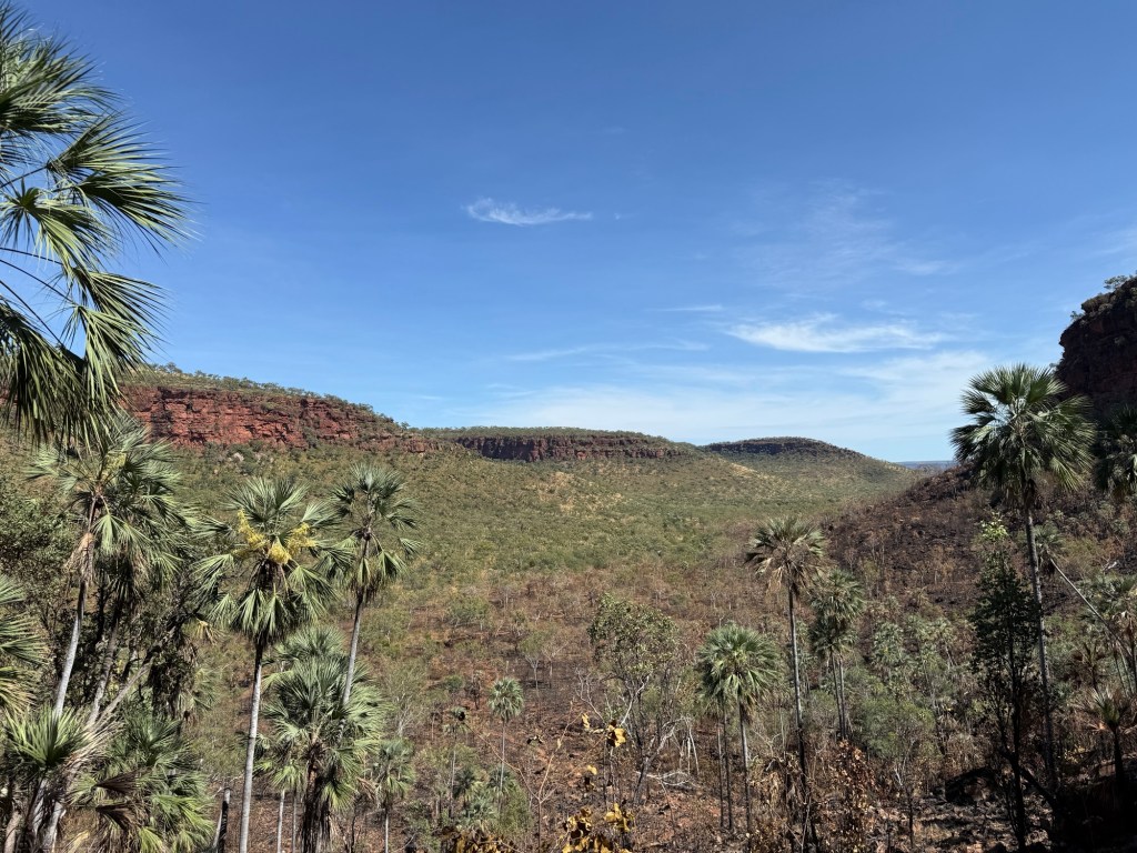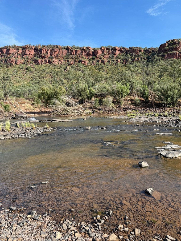 From the Roadhouse we did a bit of exploring , tripping down to the 1800s Old Victoria River Crossing and then out for Allthego to do a ‘ short walk’ at the Joes Creek day use area. It is a short 1.7 km (90 min) up a steep slope, along the base of the escarpment, then a scramble down to Joes Creek and the walk back to the carpark. Some great views of the valley from the escarpment and sightings of aboriginal art galleries on its walls.