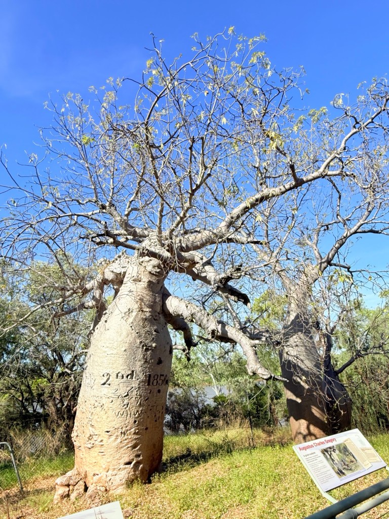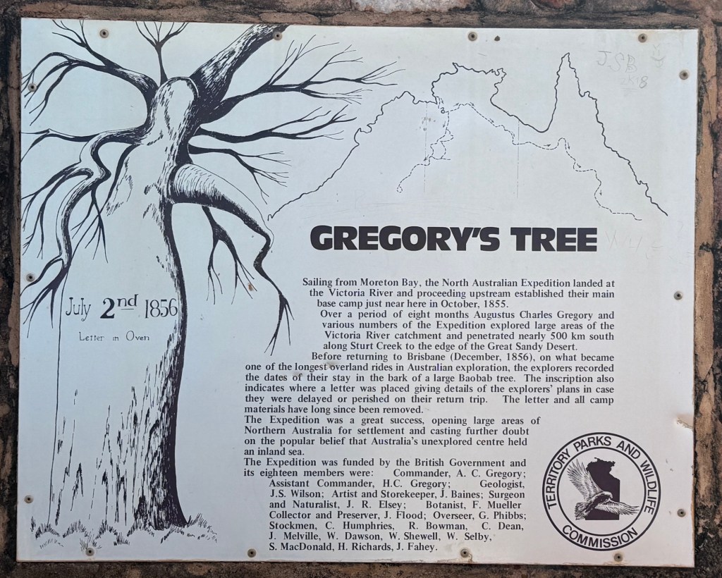 The Victoria River dominants the landscape here as well. One of the attractions, about 5 km off the hwy down a dirt track, is an old boab tree beside the river bearing the carved date 2 July 1856. It is known as Gregory’s Tree and is the spot where he camped while exploring these parts.