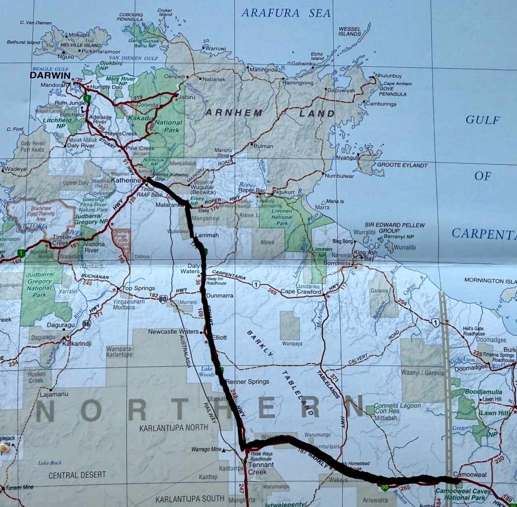 Here is map showing our journey from Camooweal along the Barkly Hwy and then up the Stuart Hwy to Katherine.