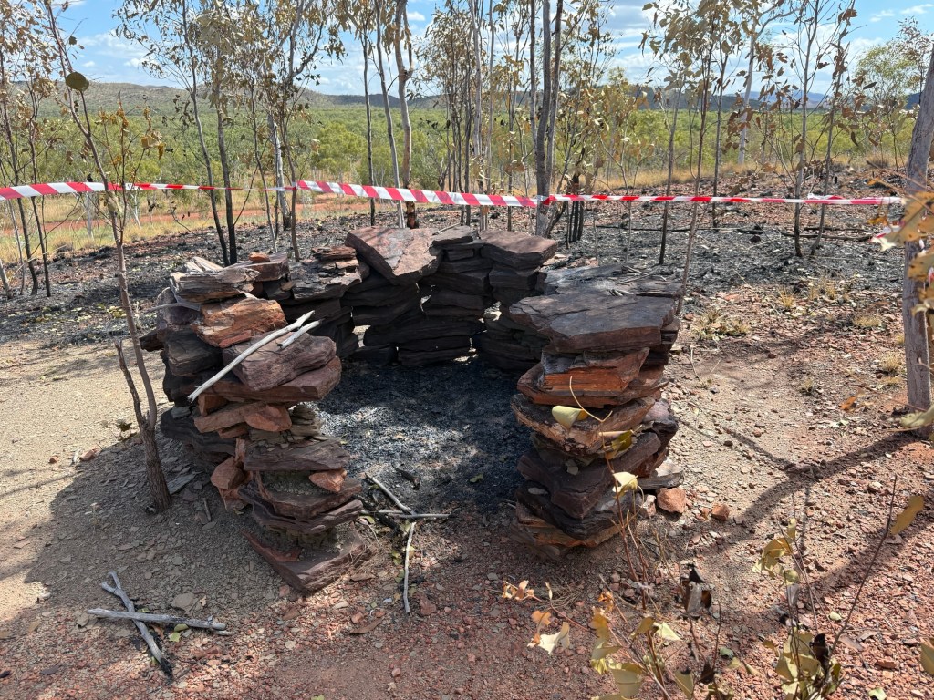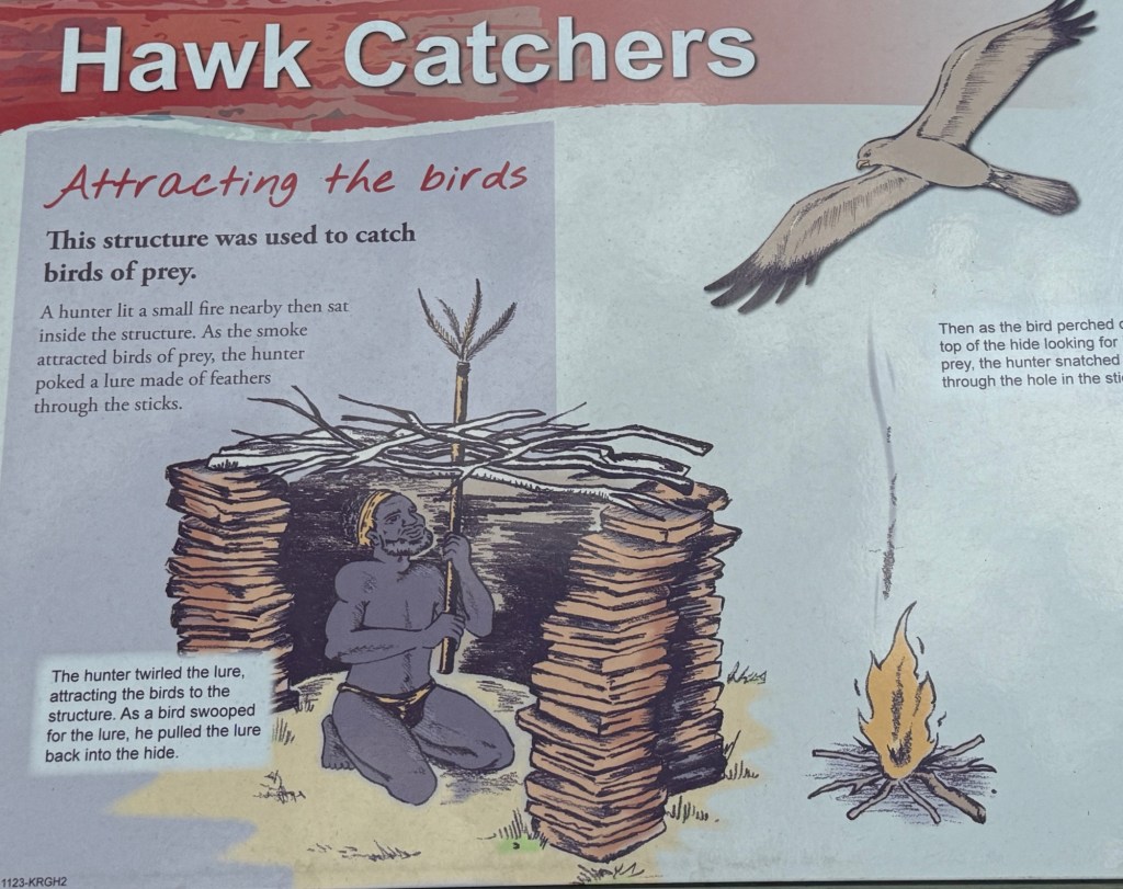 Remember those hawks circling above the fire looking for getaways?Well, said hawks would also circle above this rock structure. They were attracted by the smoke, and when the character inside stuck a furry lure up on a stick and waved it around the hawk would land on the branches and twigs trying to catch the ‘animal’ for tucker!