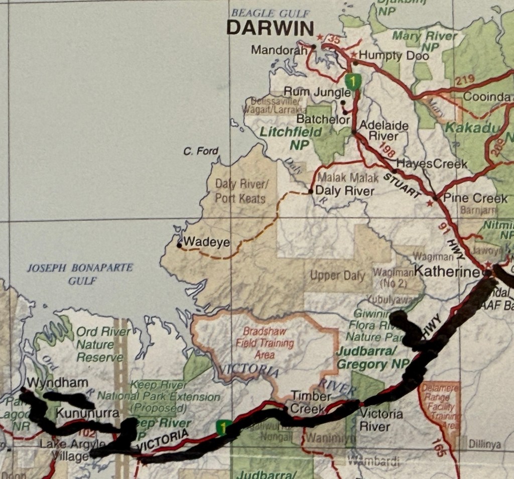 The little map below follows the route from Katherine across the WA border to Kununurra.