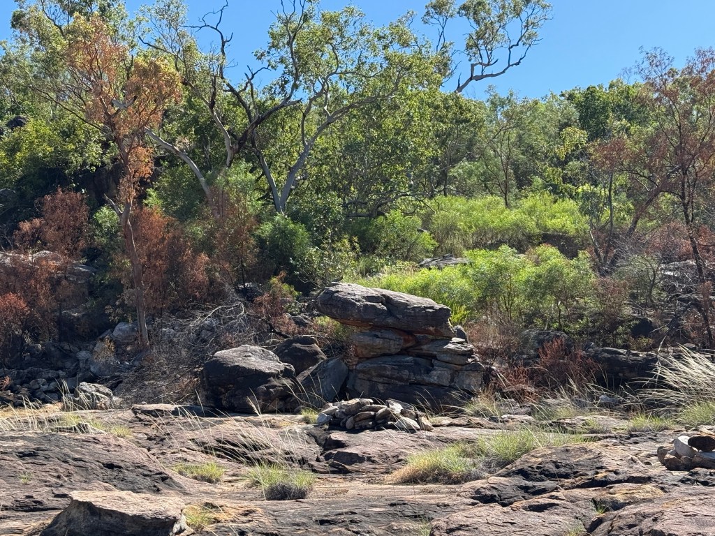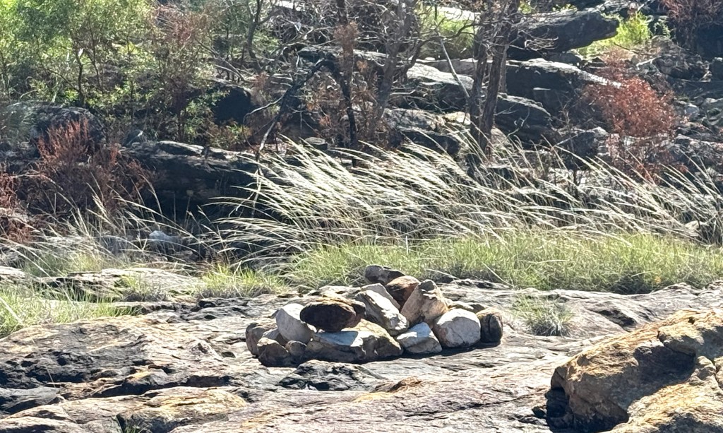 A little further we pass an Aboriginal burial area. We saw two neat piles of rocks on a broad sandstone area. Apparently, when near death an Aborigine would be laid here and covered with the rocks. According to the tradition the body fluids would seep through the rock into the deep pool at the bottom of Mitchell Falls. This is where the Rainbow Spirit creator lives. So the person returns to the ‘country’ from where they came.