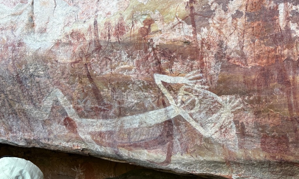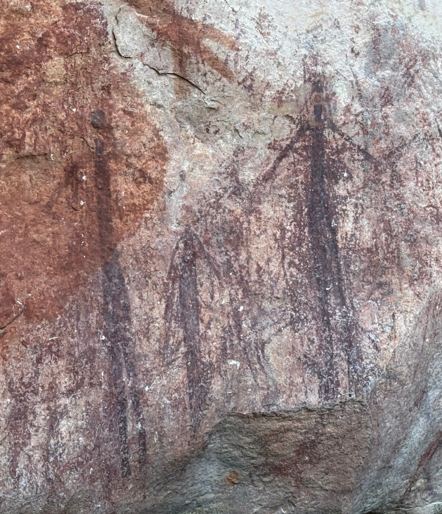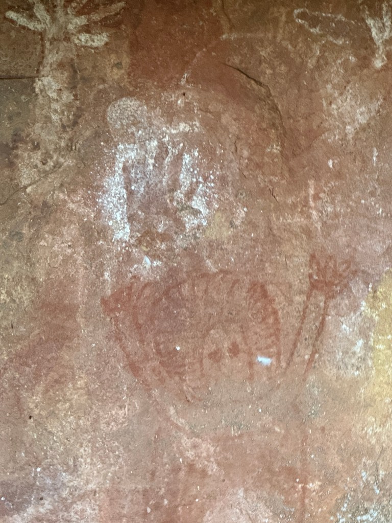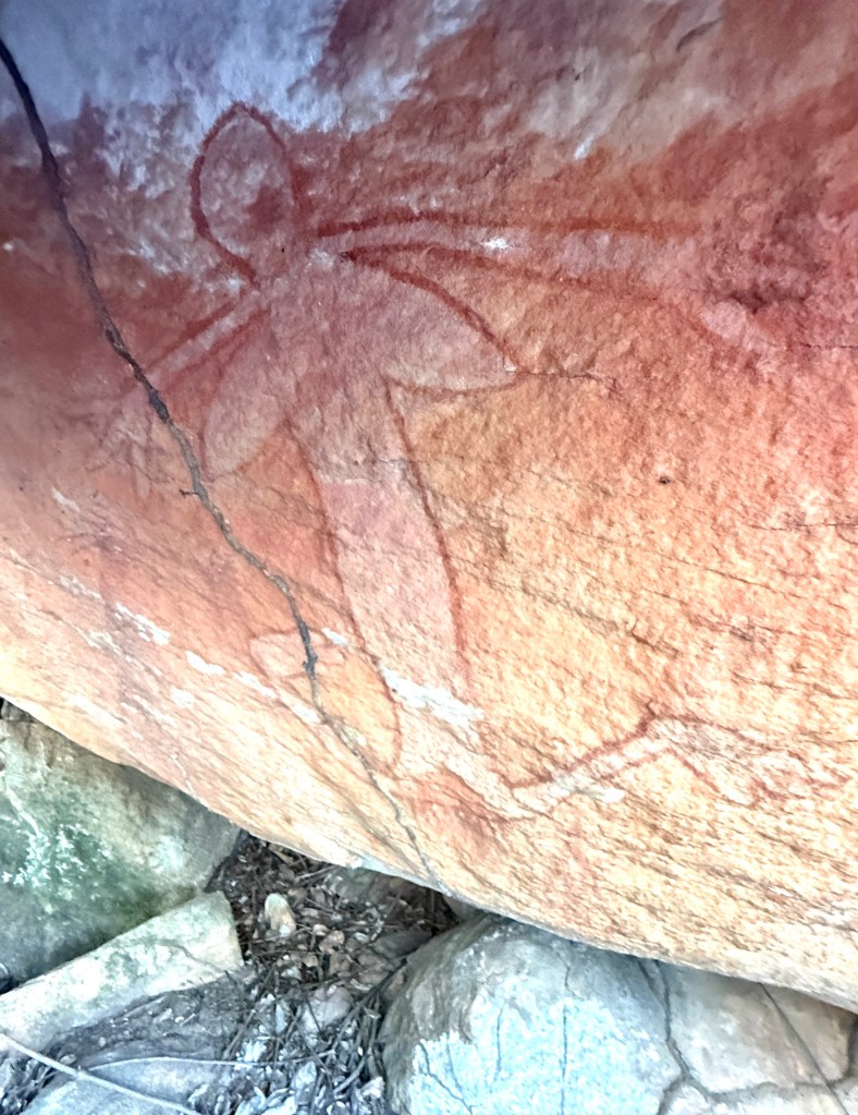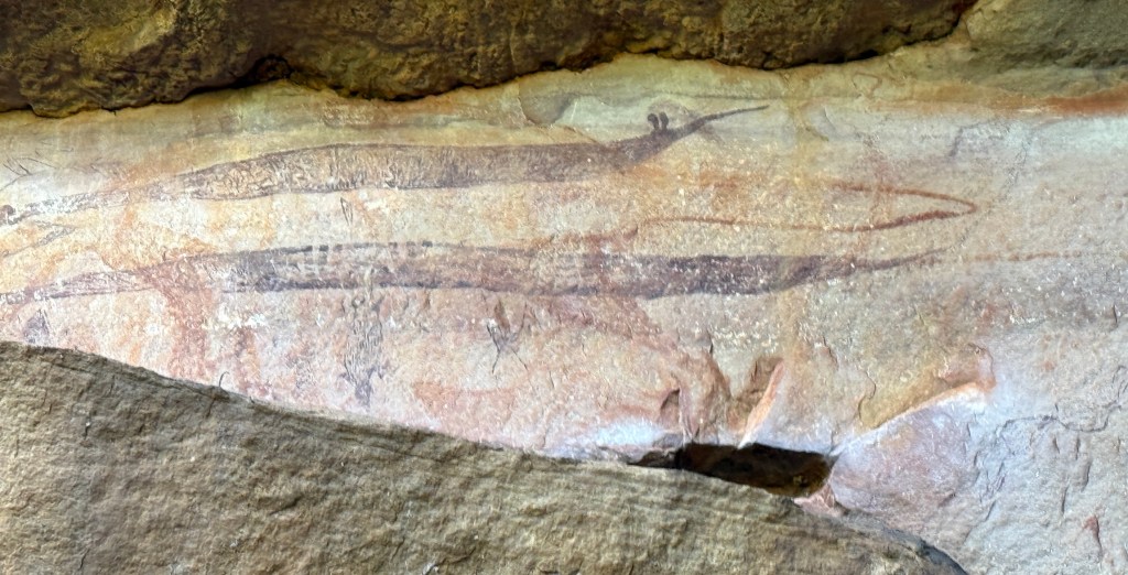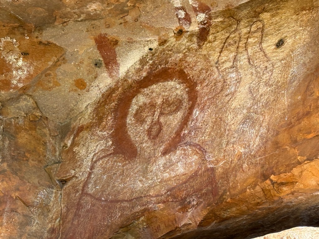 Our pilot/guide showed us around a number of sites near the pool with different ages and types of artwork, some of recent origin but others dated at thousands of years. A few examples in the photos below, I have annotated from my best recall (which might be sus) of the commentary.