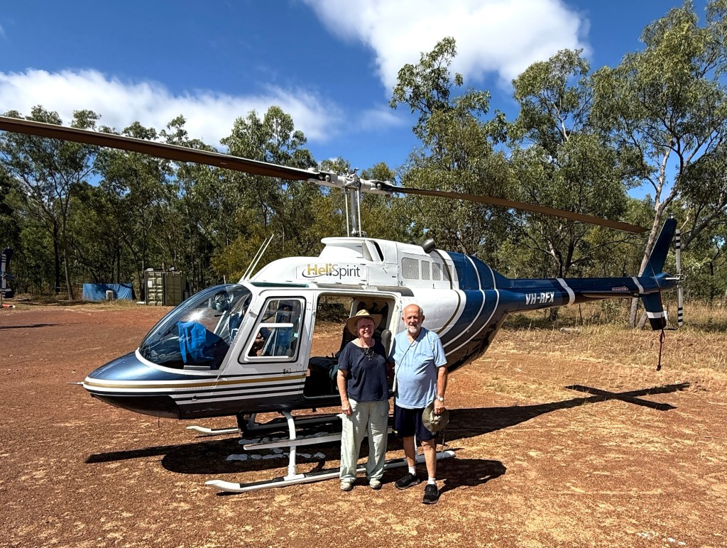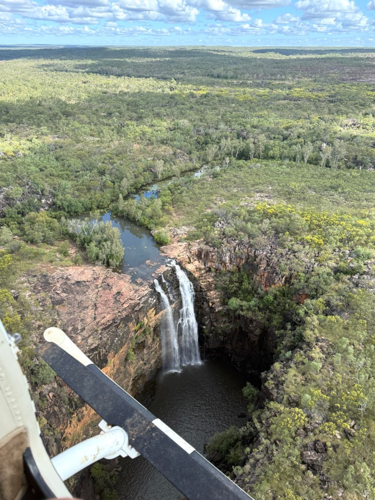 A ten minute Bell Helicopter jaunt down to a chopper pad beside the Mitchell River, 100 metres or so before the river plunges over the 4 level drop to the river far below.