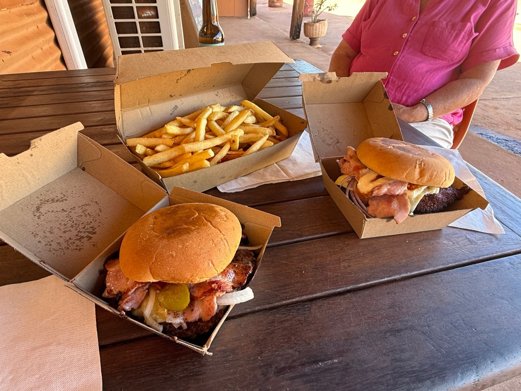 We had arrived at lunchtime and after paying our site fees for Manning Gorge indulged in the compulsory Mt Barnett burgers. Allthego enjoyed a cheeseburger and Homealone a peri peri chicken burger. Now, they didn’t come with chips! Extra $12 for a largish box. All up $58.