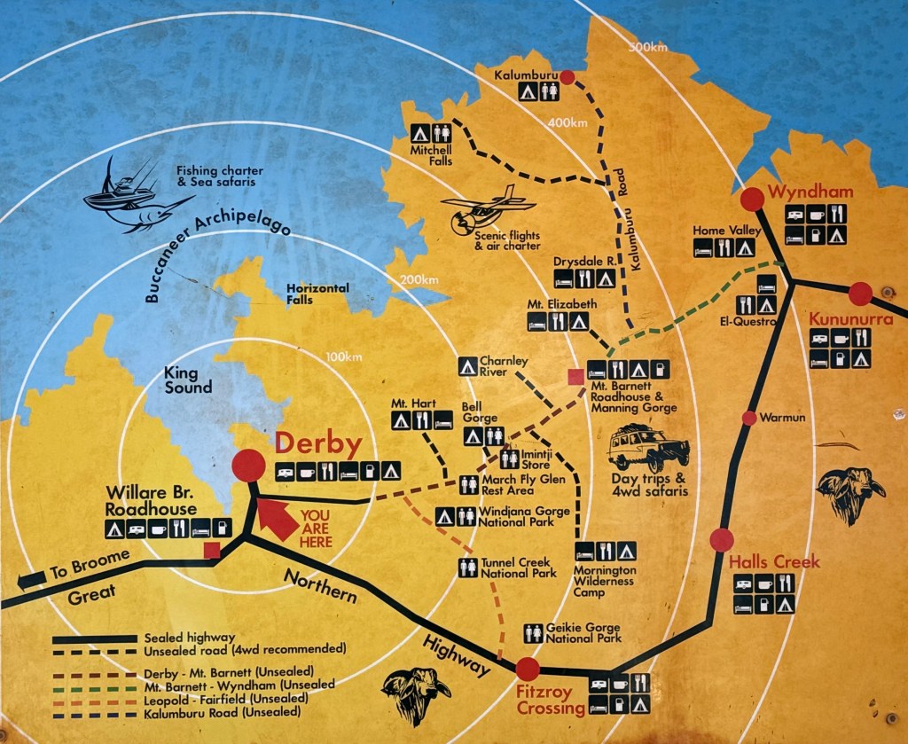 Here is a map of the journey along the Gibb, starting at Kununurra and ending at Derby. Many of our stops are marked on it.