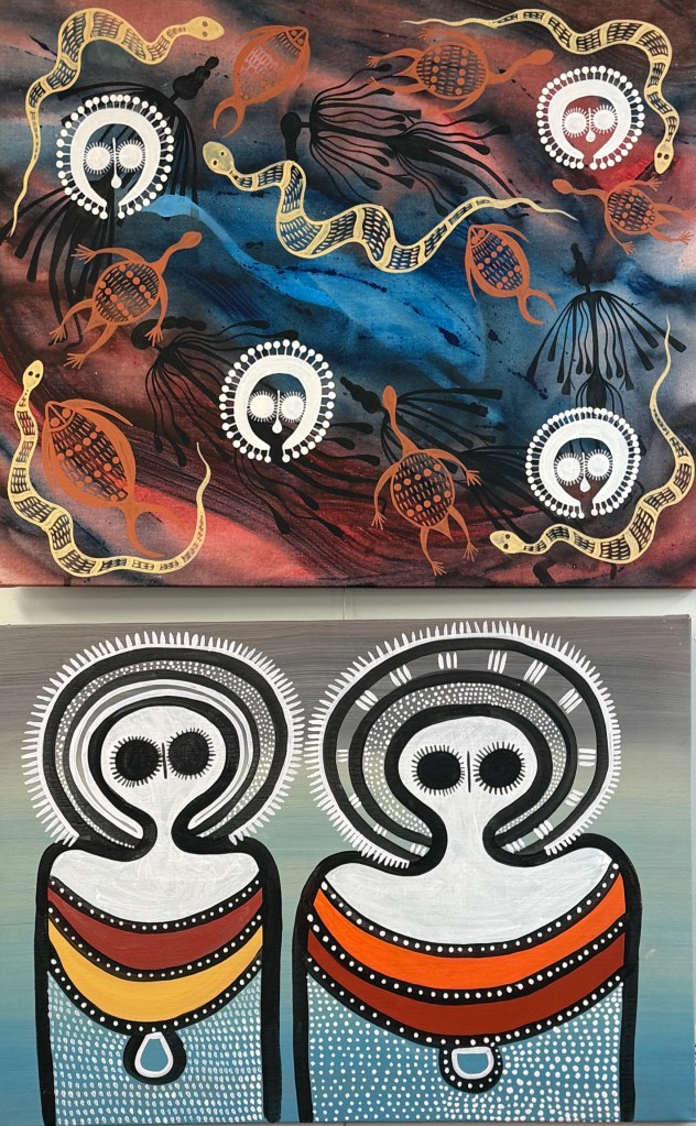 Some interesting works by him and others on display. Indigenous themes, many Wandjina and Gwion Gwions (Bradshaws), the later are the sticklike figures. We had a lunch snack here while looking around.