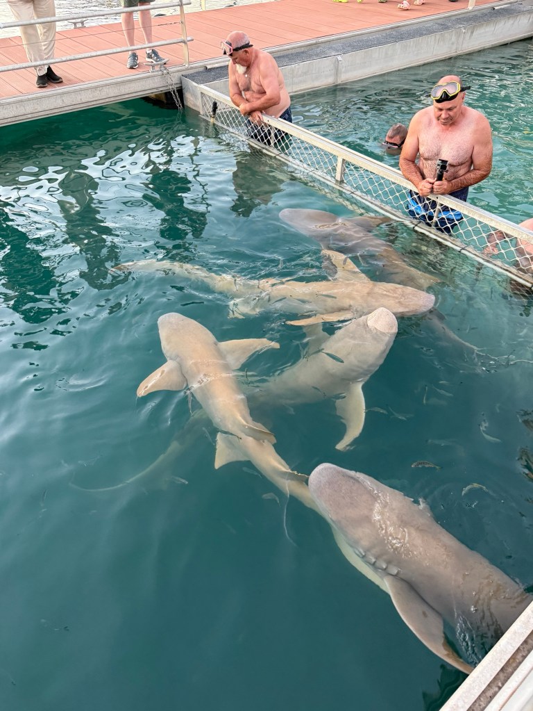 Next to the cage a flotilla of sharks gathered to feast on bits of barramundi thrown in by one of the crew. Various other fish also gathered for the event. The sharks ignored the swimmers, they are blind and generally bottom feeders and dwellers. The sharks not the swimmers. Entertaining.